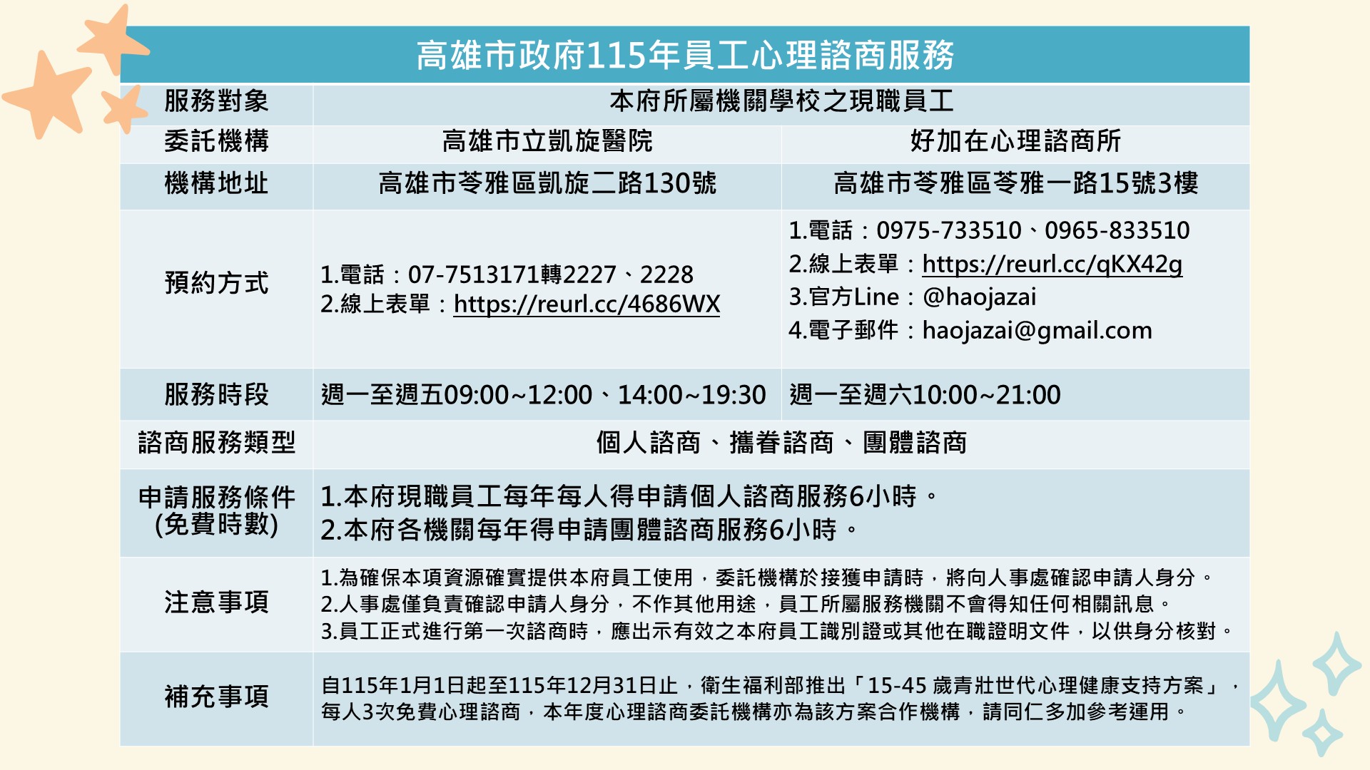 - 本府現職員工每年每人得申請個人諮商服務6小時。